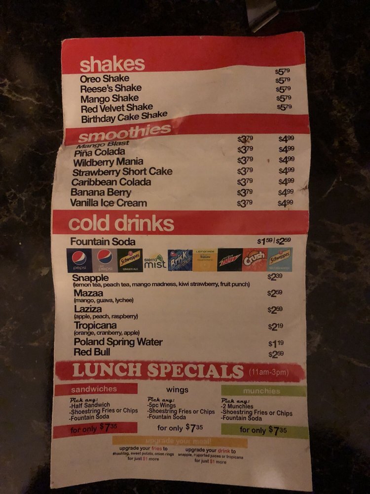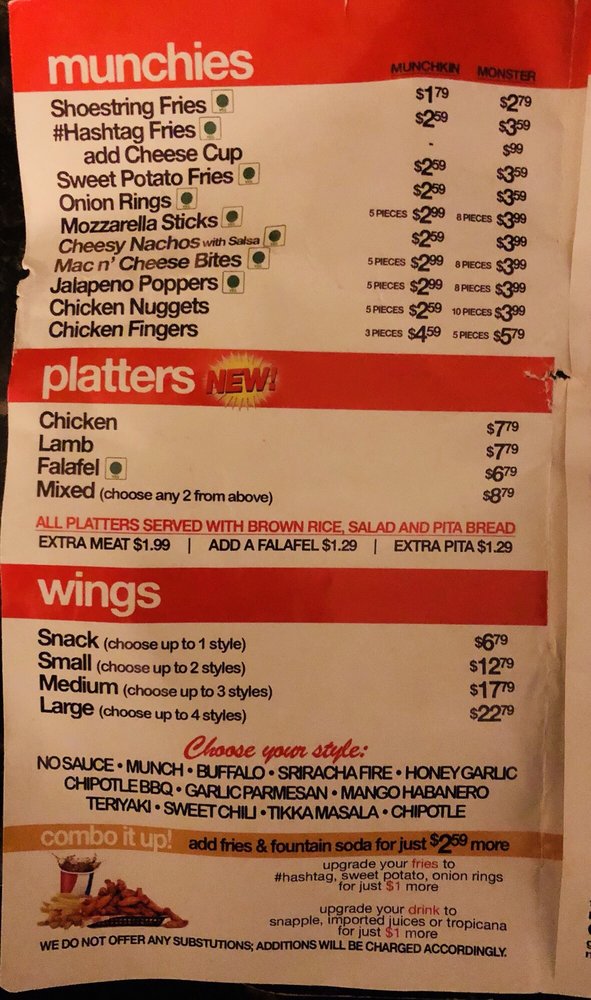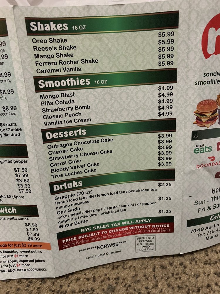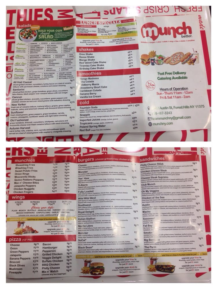 “ I wanted to order online, but went there myself because their website wouldn't let me order even though it was 1.5 hours before closing time. Their in-store menu was unclear, as was their online menu, so I had to ask them what a few items were. I ordered a Yee-Haw burger and 'Small Wings' (which was 10 wings). 'Munch' and chipotle sauces for the wings. I looked around while I waited. NY1 on their TV and middle eastern music through the speakers. No other customers there (but the cashier felt it necessary to ask me for my name for the receipt). I waited maybe 5-10 minutes. The burger was cooked medium (they didn't ask and I didn't specify). Slightly on the soggy side, but fine. It's a smaller burger, but that's what I expected given the price. The wings were juicy and the sauces were interesting. The 'Munch' sauce was spicy, sweet, tangy, with hints of mustard. The chipotle sauce was not spicy. Both the burger and the wings had strong flavors. Not refined or nuanced, but I wouldn't expect that from a place called Munch. They placed the wings in an aluminum foil tray, and the burger in a foil wrapper. This would be a nice place for a late night snack if they were open late, but they're not. I wouldn't be opposed to returning if the timing were right. ”