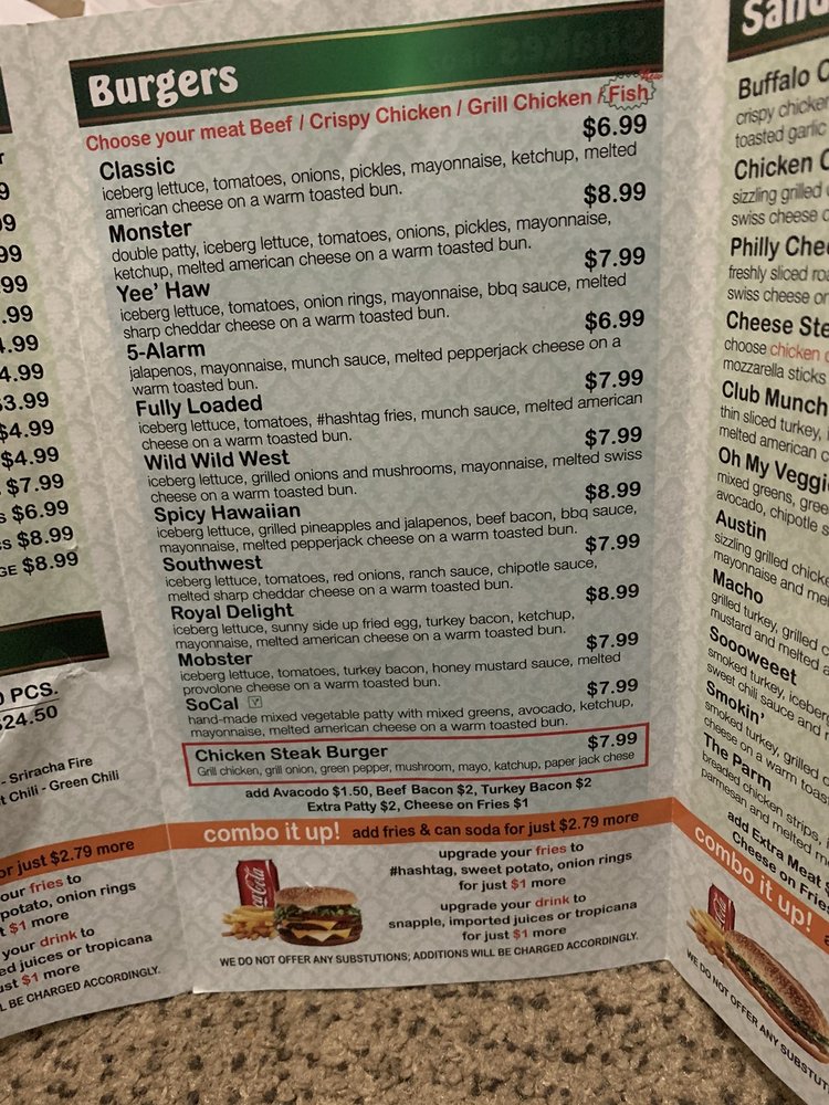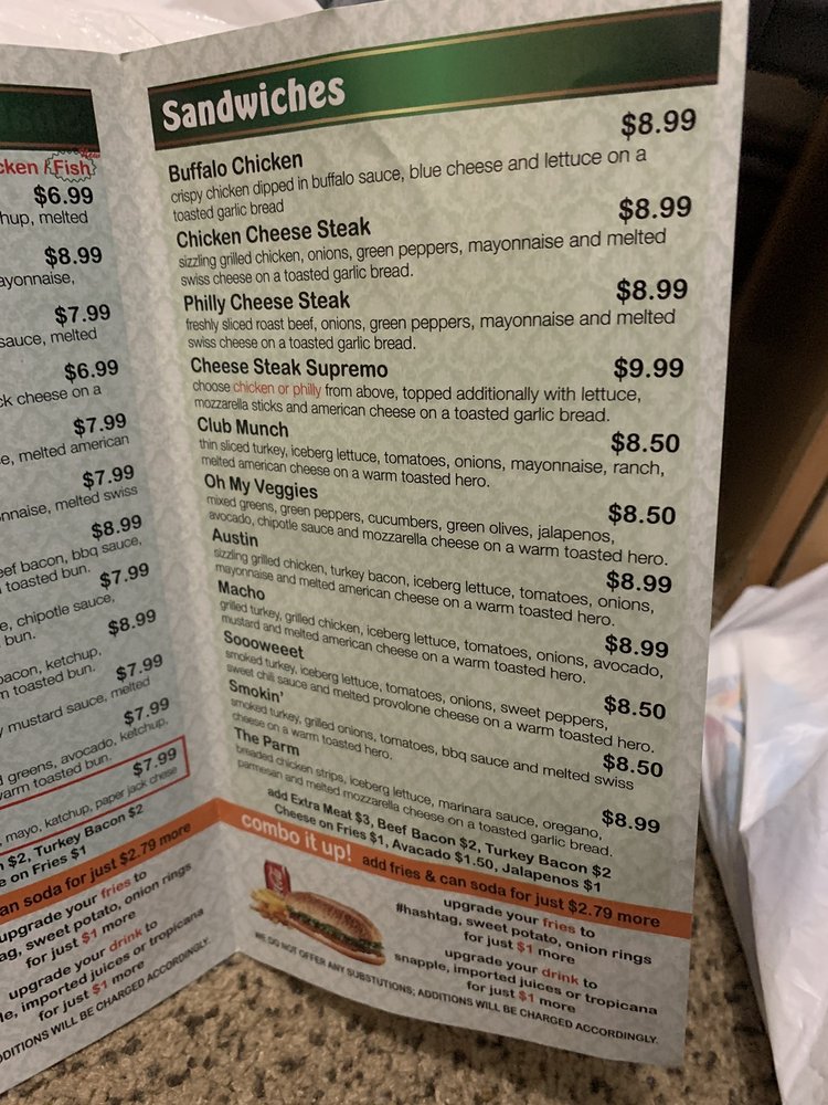 “ I ordered take out from Munch last night and left happy. I walked over and ordered from the counter. I got an Austin sandwich with chicken and made it a meal. My wife got the cheese steak supreme with chicken. We went halvsies. When I opted to get the meal it came with fries and a drink. The drink was kind of small but they definitely hooked the fries up. Both sandwiches were really big and delicious. We would definitely go back and check this place out again. Might even become a regular take out spot. ”